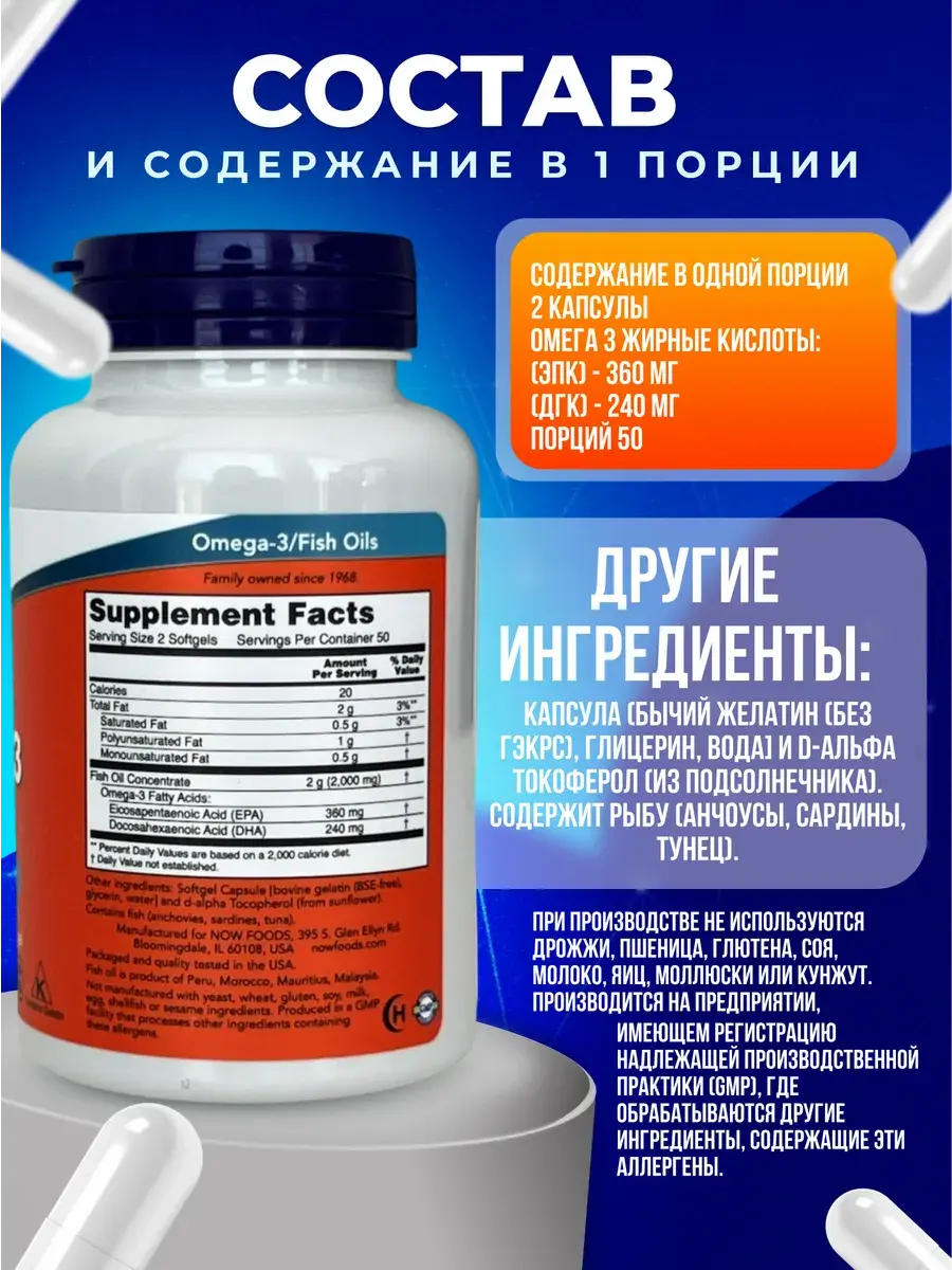 Витамин Омега 3 - это незаменимый витаминный комплекс в капсулах для женщин и мужчин. Прием препарата NOW Omega-3 укрепляет иммунитет, улучшает работу головного мозга, поддерживает остроту зрения,снижает уровень холестерина, также играет большую роль в профилактике сердечно-сосудистых и онкологических заболеваний. Омега-3это одна из лучших добавок для женщин, которая помогает поддерживать красоту и здоровье. При регулярном применении улучшение здоровья кожи, волос и ногтей отмечается уже через 2-3 недели. Также приём Омега-3 стабилизирует эмоциональное состояние во время ПМС.Для чего необходим Vitamin D3?Витамин Д3 необходим организму для поддержания иммунитета и высокой сопротивляемости инфекционным заболеваниям, в том числе ОРВИ и гриппу. Прием препарата Витамин Д3, необходим для поддержки сердечно-сосудистой, нервной системы и репродуктивной функции организма. Витамин Д3 способствует укреплению костей, нормализует сон, улучшает настроение, наполняя организм серотонином "гормоном счастья" на целый день. Почему нужно принимать вместе Omega-3 и Vitamin D3 - Омега-3 и витамин Д3 – уникальный тандем, который позволяет микроэлементам в несколько раз усилить действия друг друга, поэтому принимать их вместе не только можно, но и рекомендовано многими врачами. Омега-3 и витамин Д это уникальный источник жизненных сил и полезных веществ для здоровья человека.Омега-3 - жирные кислоты оказались особенно эффективны для снижения уровня атерогенных триглицеридов в крови, а также плохого холестерина - липопротеидов низкой плотности. Применение омега 3 жирных кислот корректирует соотношение в организме человека простагландинов группы 2 и гр.3, что восстанавливает регуляцию воспалительного процесса, аллергических реакций, болевого синдрома, свёртываемости крови, многих функций желудочно-кишечного тракта, почек и также нервную систему. Применение жира морских рыб омега нау приводит к нормализации показателей вязкости крови, рыбий жир препятствует развитию тромбозов.