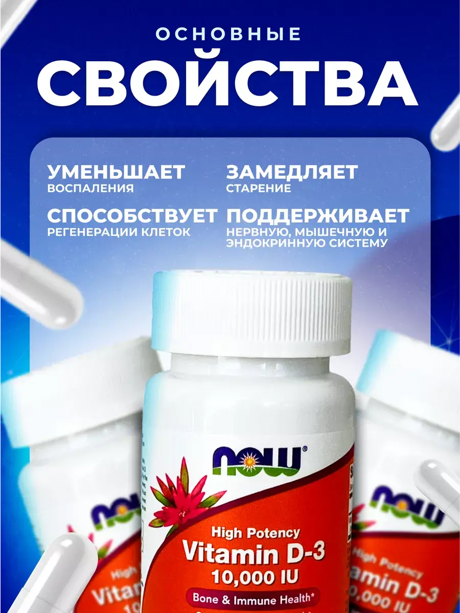 NOW Vitamin D3 в мягких гелевых капсулах – мировой лидер продаж с миллионами довольных клиентов. Добавка производится на территории США, компанией с 55-летней историей в соответствии со стандартами GMP и FDA, не содержит ГМО. Исследования показали: среди миллиона жителей России дефицит витаминов группы D присутствует более чем у 83,5% людей. Представляем вам уникальный продукт, который поможет вам достичь оптимального здоровья и благополучия – NOW Vitamin D3! Эта удивительная добавка обеспечит ваш организм необходимым количеством витамина D3, который играет невероятно важную роль в поддержании жизненно важных функций организма. d3 now – это не просто витамин, это ключ к вашему здоровью. Витамин D3, также известный как холекальциферол, является биологически активной формой витамина D. Он влияет на множество процессов в организме, особенно на уровень кальция и фосфата, что является фундаментальным для здоровья костей и зубов. Современные исследования показывают, что дефицит витамина D3 распространен у большинства людей. Это может привести к серьезным проблемам со здоровьем, снижению иммунитета и увеличению риска развития различных заболеваний, включая диабет и сердечно-сосудистые проблемы. Недостаток витамина д3 также может негативно сказаться на здоровье костей, приводя к остеопорозу и хрупкости костей. Однако, несмотря на все эти факторы, вы не должны беспокоиться, потому что NOW Vitamin D3 здесь, чтобы помочь вам! Наш продукт разработан таким образом, чтобы обеспечить вам оптимальное количество витамина D3, необходимого для вашего здоровья и благополучия. NOW Vitamin D3 имеет множество выгодных эффектов на ваш организм. Во-первых, он поддерживает и укрепляет ваш иммунитет, что позволяет вам бороться с инфекциями и болезнями более эффективно. Сильный иммунитет – это ключевой фактор в поддержании общего состояния здоровья. Во-вторых, NOW Vitamin D3 помогает улучшить обмен веществ. Он способствует правильному усвоению кальция и фосфата, что особенно важно для поддержания здоровья костей и зубов. NOW Vitamin D3 также оказывает положительное влияние на вашу нервную систему и сон. Регулярное употребление добавки способствует успокоению нервов, улучшению качества сна и общему состоянию расслабления. Благодаря этому, вы сможете ощутить повышение своей энергии и жизненных сил. Одно из самых привлекательных свойств NOW Vitamin D3 заключается в его положительном влиянии на мужское и женское здоровье. Витамин D3 играет важную роль в регуляции выработки половых гормонов, способствуя поддержанию здоровой репродуктивной системы. Это особенно важно для женщин во время беременности, поскольку NOW Vitamin D3 помогает поддерживать здоровье как у матери, так и у ребенка. NOW Vitamin D3 также оказывает благотворное воздействие на щитовидную железу. Он помогает нормализовать гормональный фон, способствуя гармоничному функционированию организма. Сбалансированная работа щитовидной железы имеет огромное значение для общего состояния здоровья и влияет на множество важных процессов в организме. Кроме того, NOW Vitamin д3 способствует омоложению кожи. Он помогает улучшить состояние вашей кожи, делая ее более упругой, сияющей и здоровой. Борьба с признаками старения становится эффективнее благодаря регулярному приему NOW Vitamin 10 000ме. Применение NOW Витамин 10 000IU просто и удобно. Рекомендуется принимать до